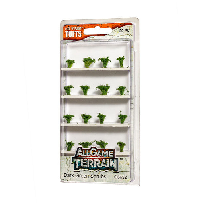 Dark Green Shrubs are designed to represent natural, healthy undergrowth often found in wet regions on your terrain feature, miniature base or gaming board. Dark Green Shrubs are ready-made and can be used right out of the package. Simply peel the Tufts from the tray and plant where desired.