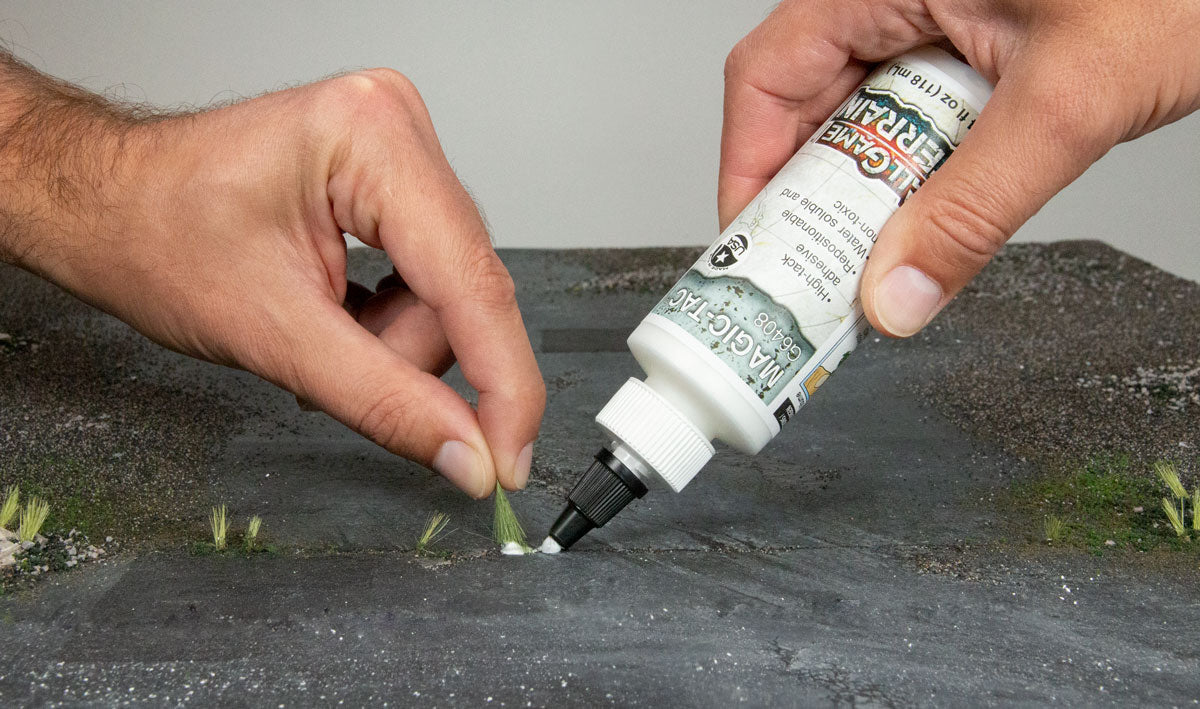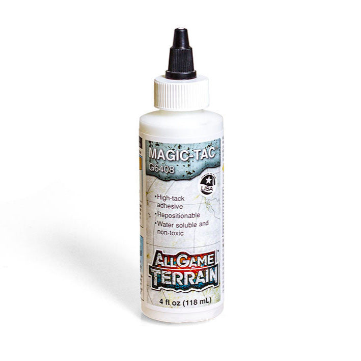 Magic-Tac™ is a high-tac adhesive. It is thick and full bodied, yet flexible. It is great for Tall Grass, Static Grass, and making custom tufts for your terrain feature, miniature base or gaming board. Magic-Tac is water soluble and non-toxic.